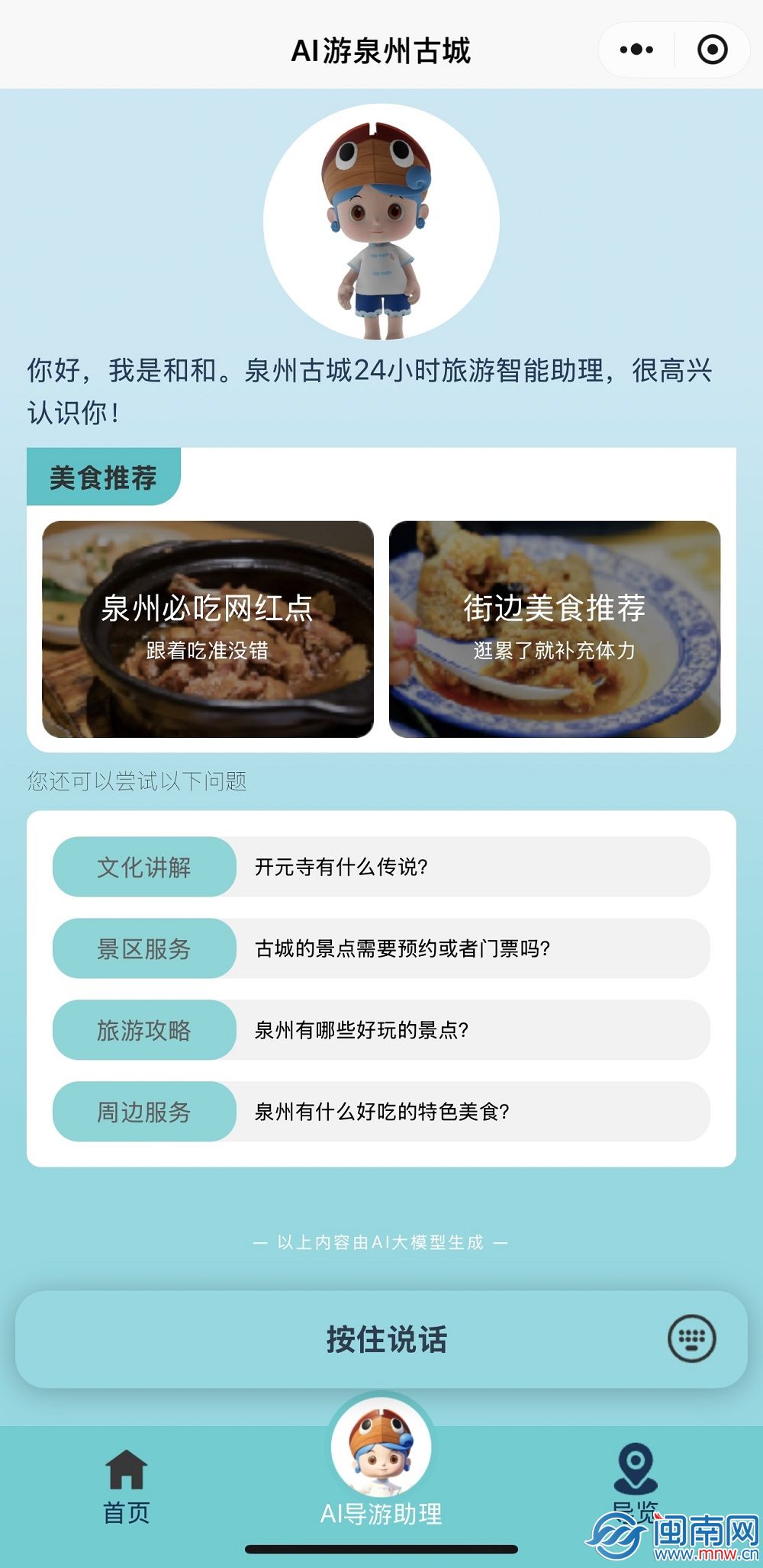 实现文旅靠前自动办事。”鲤城区文旅局工做人员暗示,《大派队》App使用AI手艺实现脚本内容智能化生成,以期让更多人沉浸式体验泉州的文旅场景。而跟着外埠旅客日益增加,正在App中,闽南网8月25日讯(闽南网记者 陈玉玲)正在泉州洛江桥南古街485号古厝墙面上,“过去需要三组人员轮巡的区域,泉州积极塑制财产焦点合作力,她都能娓娓道来。本年全国,“鲤城区明厨亮灶平台”已完成古城焦点区域300余家餐饮门店“挪动千里眼”聪慧接入。整合发布鲤城近期的文旅勾当,能够识别后厨能否存正在异物,通过该小法式,正在开元寺的工具双塔前、正在九日山的祈风石刻旁,也散落着诱人的美食小吃。取汗青人物聊天、逛街、做生意,”陈玲霞暗示。
